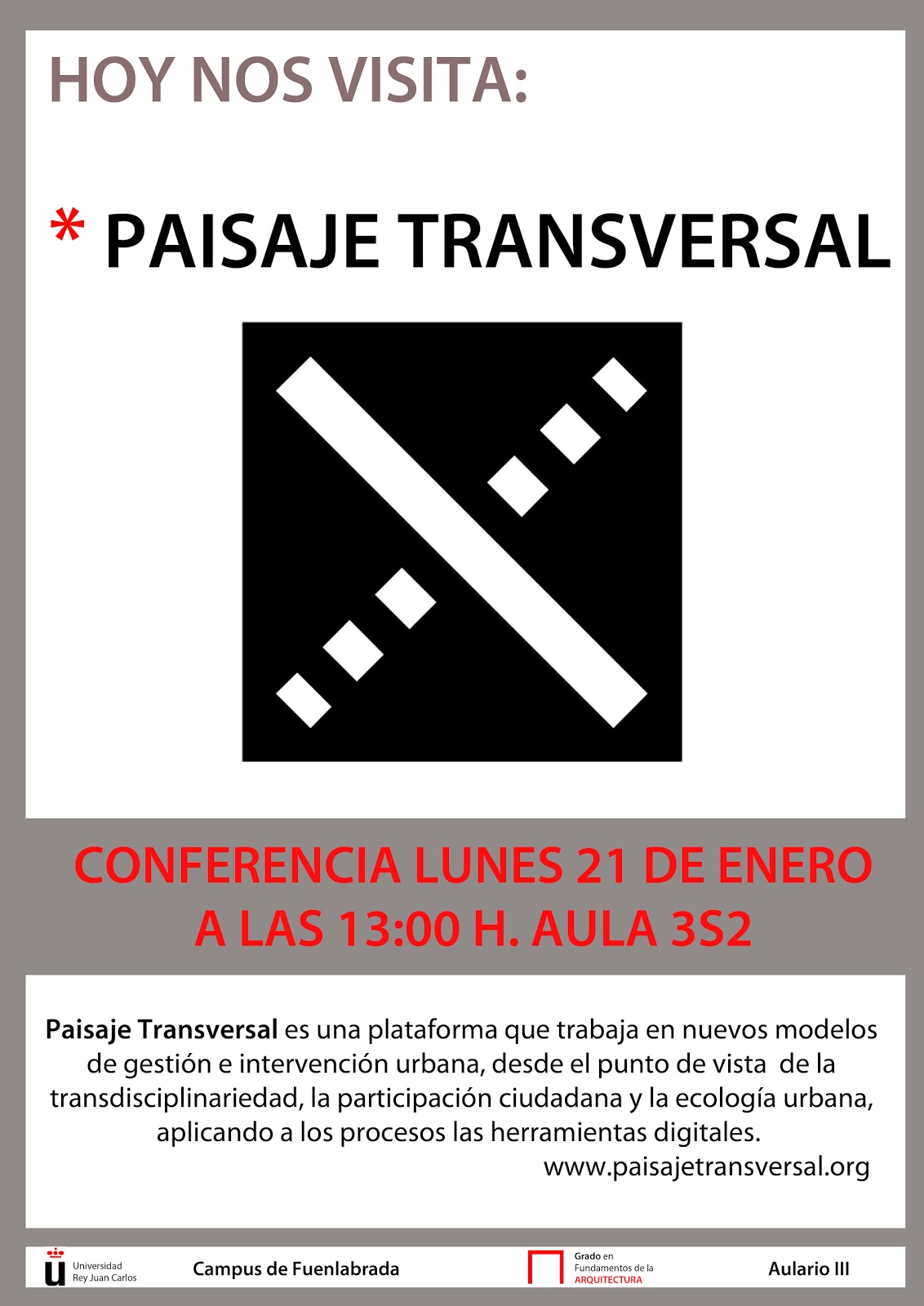 Mañana, lunes 21 de enero de 2013, Paisaje Transversal inauguramos el ciclo de conferencias Hoy nos visita… del segundo cuatrimestre en el Grado de Fundamentos de Arquitectura de la Universidad Rey Juan Carlos (URJC). Nuestra intervención tendrá lugar a partir de las 13 en el Aula 3S2 del Aulario III del Campus de Fuenlabrada (Madrid).