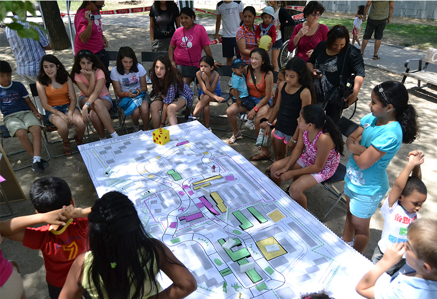 During the past six years, the regeneration process in Virgen de Begoña has been propelled by activism from within the community. Each June, we have joined residents for Fiestacción, a yearly gathering to celebrate local culture and civic engagement. At Fiestacción, we have carried out various initiatives, taking shape as inclusive games with pedagogical elements. Early in our collaboration, we hosted a giant game of Trivial Pursuit that also introduced discussion of local geography, history, and neighborhood dynamics.