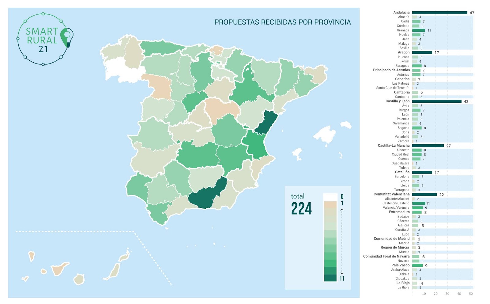 El pasado 11 de mayor de 2020 finalizó el plazo para presentar candidaturas a la convocatoria europea Smart Rural 21. Los números no dejan lugar a dudas sobre el éxito de la misma: se presentaron un total de 736 solicitudes en toda Europa. España ha sido el país de la Unión Europea con mayor representación con un total de 224 candidaturas. Sin duda, este abultado número es un claro indicador tanto del interés suscitado por el proyecto, como de la imperiosa necesidad de los pueblos y zonas rurales por promover estrategias inteligentes que les permitan afrontar con garantías los retos y problemáticas que afrontan las zonas menos pobladas de nuestro territorio.