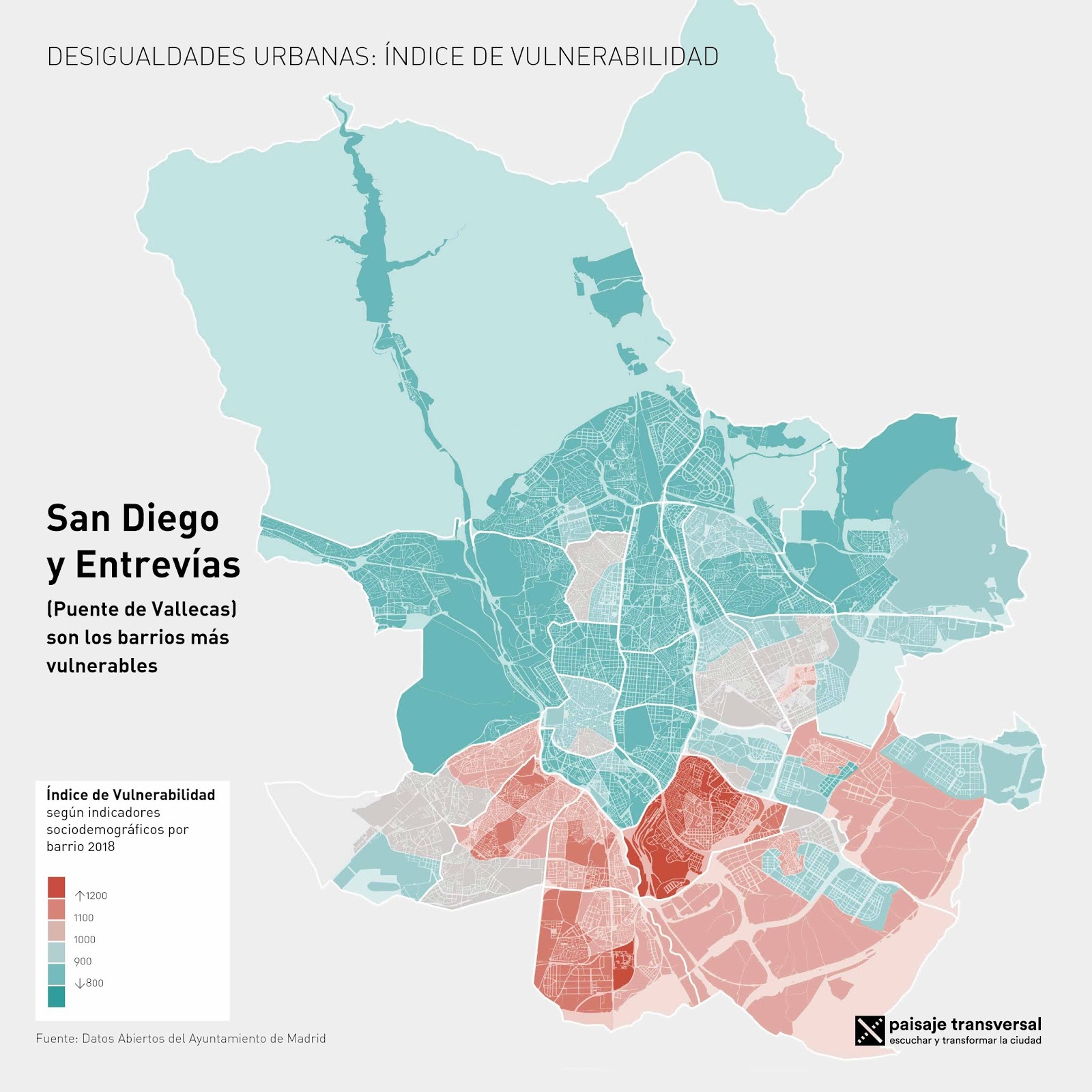 Imagen 2: Cartografía del índice de vulnerabilidad por barrios de Madrid (fuente: Paisaje Transversal)