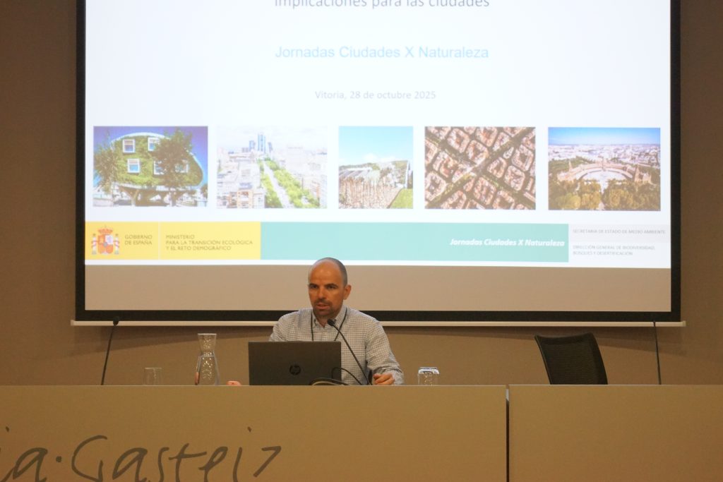 Por parte de Vitoria-Gasteiz, la presentación corrió a cargo de Eduardo Rojo Fraile, jefe del Servicio de Espacio Público y Medio Natural del Ayuntamiento, y Ane Itziar Velasco, jefa del Área de Infraestructura Verde del Centro de Estudios Ambientales (CEA), que compartieron la experiencia de la ciudad en el desarrollo e implementación de su estrategia de infraestructura verde urbana.