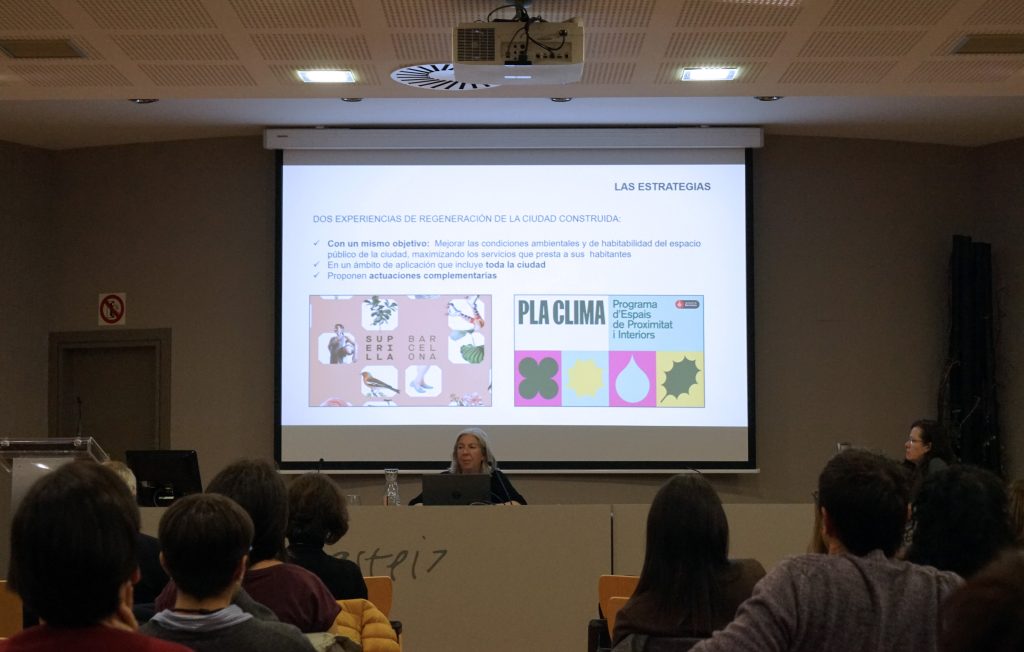 HiriakXNatura/CiudadesXNaturaleza. Presentación de programas Superilles y Espais de Proximitat i Interiors de Barcelona, a cargo de Rosa López Olmos, arquitecta coordinadora de dichos programas. Fotografía: Paisaje Transversal