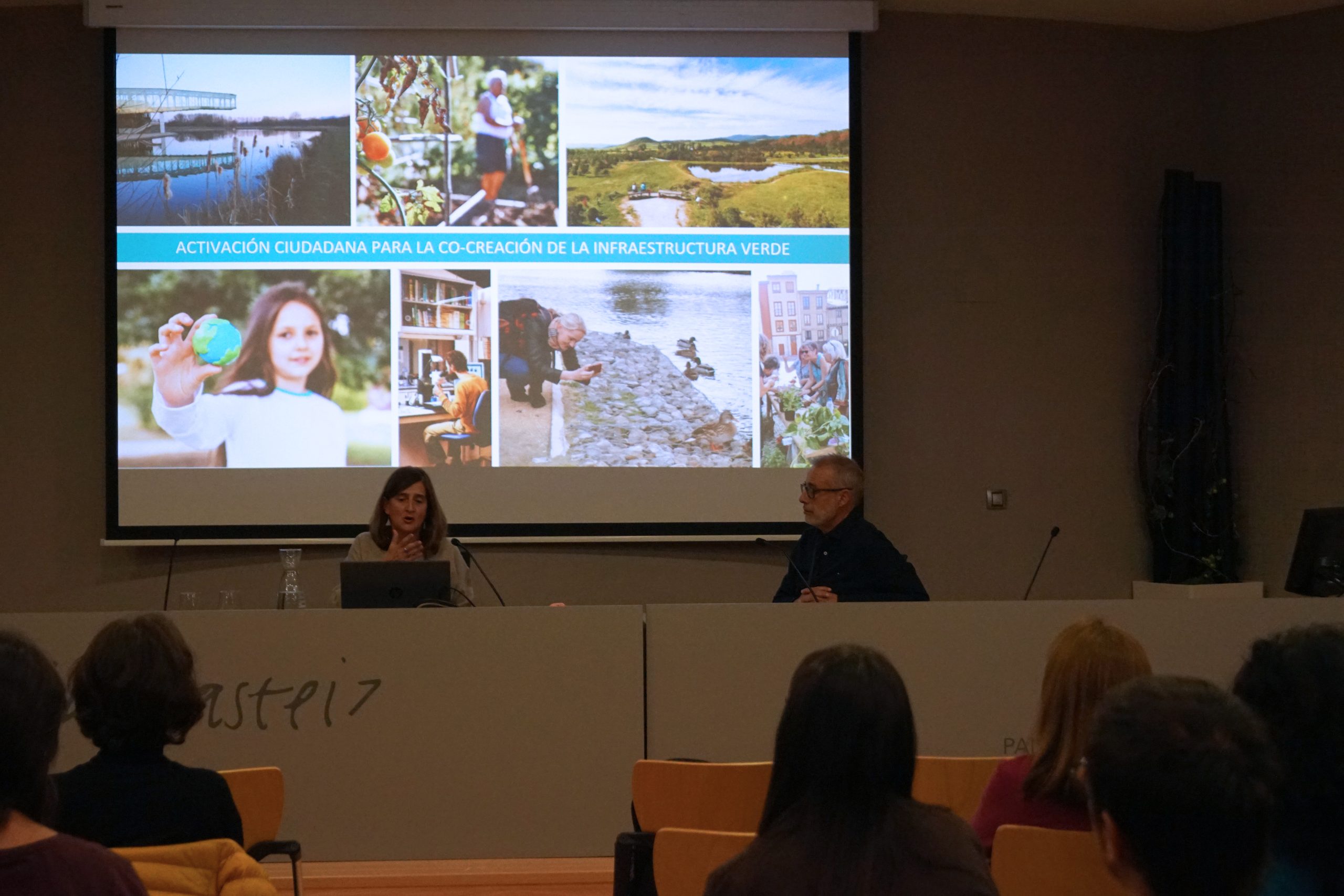 HiriakXNatura/CiudadesXNaturaleza. Presentación del Sistema de Infraestructura verde urbana de Vitoria-Gasteiz, a cargo de Eduardo Rojo Fraile, jefe del Servicio de Espacio Público y Medio Natural del Ayuntamiento, y Ane Itziar Velasco, jefa del Área de Infraestructura Verde del Centro de Estudios Ambientales (CEA). Fotografía: Paisaje Transversal