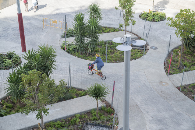 Uno de los ejes más reconocibles de esta transformación es el programa Superillas, una iniciativa que reestructura la red viaria tradicional para dar prioridad al uso ciudadano frente al tránsito motorizado. En este modelo, los vehículos ceden protagonismo a la vida peatonal, al descanso, al juego y a la conversación. El proyecto se materializa en nuevos ejes verdes y plazas que no solo modifican la infraestructura física, sino que cambian radicalmente la experiencia urbana: sombras que refrescan, vegetación integrada, biodiversidad emergente, y una notable reducción del ruido y la contaminación. El objetivo es transformar calles y manzanas en espacios de convivencia, bienestar y valor ecológico.