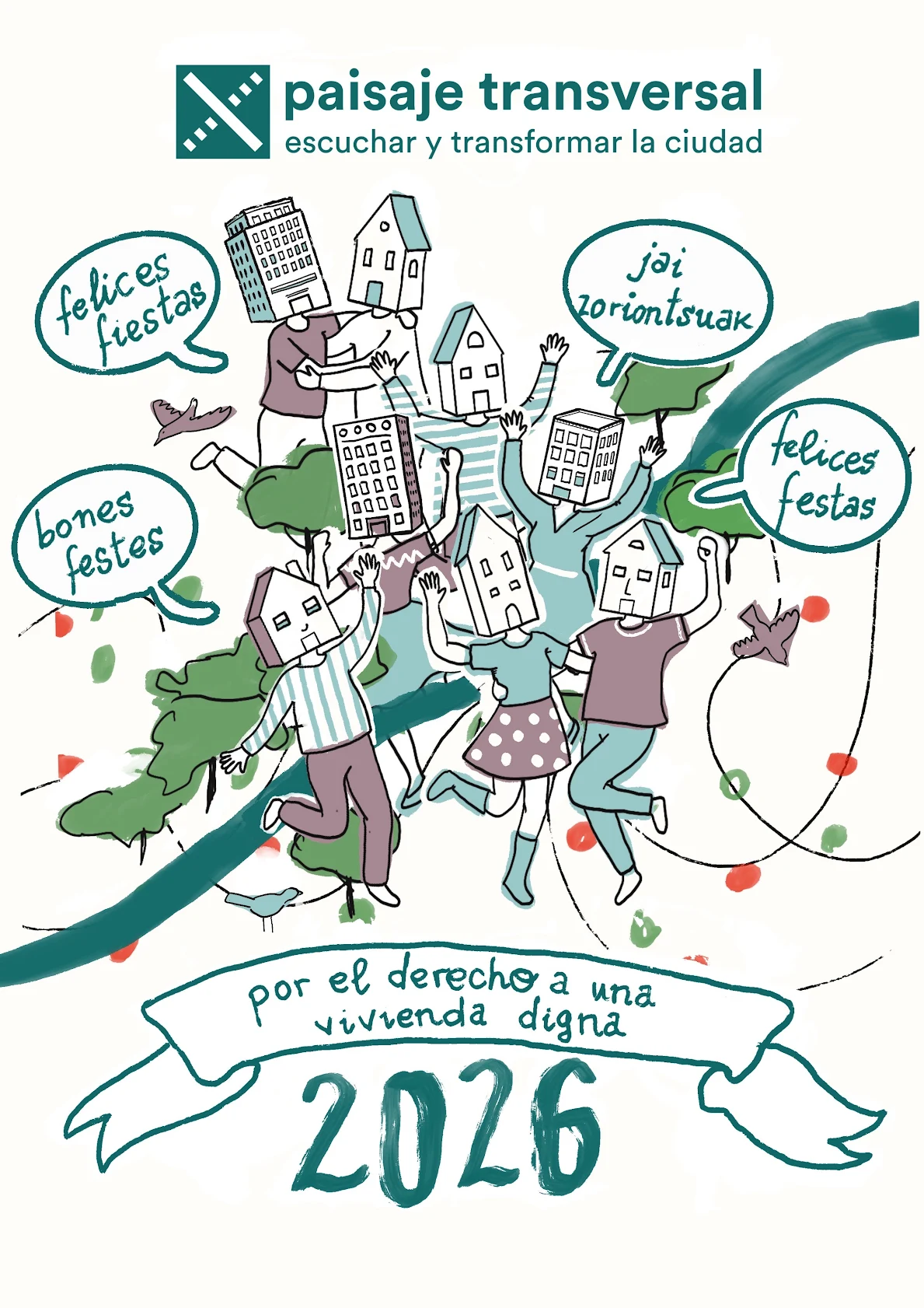 Como cada diciembre, aprovechamos para hacer balance y compartir con vosotros esta ilustración con la que os deseamos unas felices fiestas y un 2026 lleno de energía, salud, escucha, proyectos transformadores y, aunque no debería ser necesario recalcarlo, con vivienda digna para todos.