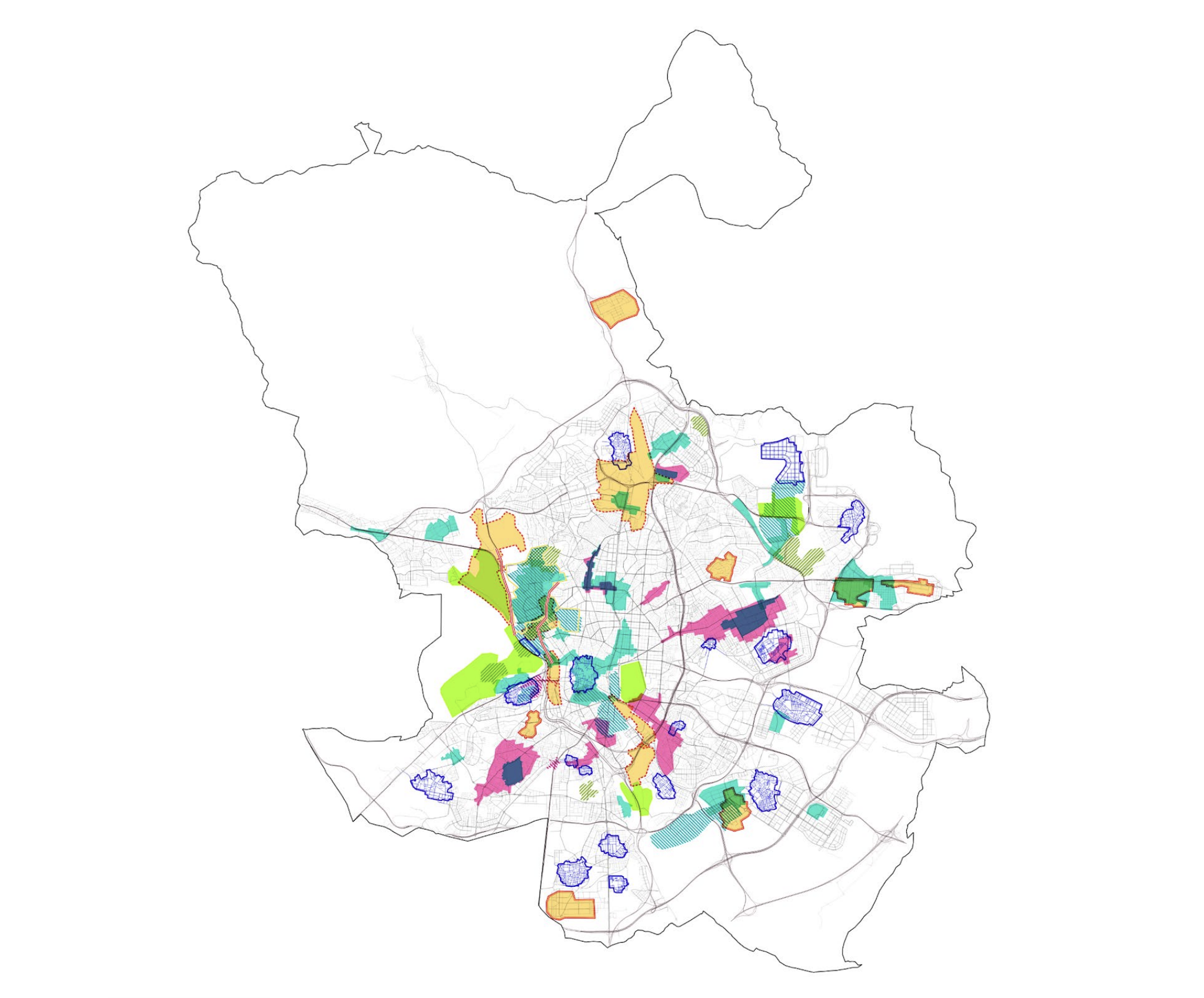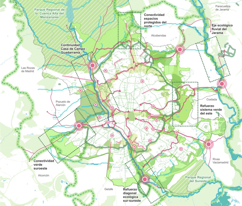 De este último, conviene destacar además que, si bien no formula aún determinaciones específicas, sí configura un marco estructural para abordar los retos del municipio de Madrid desde una perspectiva integral, avanzar hacia un modelo urbano más sostenible y resiliente e impulsar la transformación equilibrada de la ciudad mediante ejes urbanos y metropolitanos, nuevas centralidades y áreas productivas, en una estructura territorial orientada a potenciar la actividad económica, equilibrar oportunidades entre distritos, reforzar las identidades culturales y paisajísticas y reforzar la relación metropolitana.
